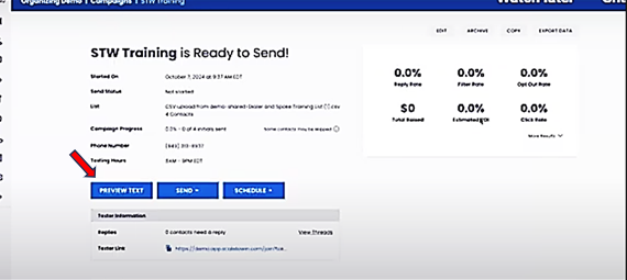 - Below the texter information there is a sample of the outgoing message. Double-check any links or phone numbers. This text has NOT been sent. Click the edit button at the top of the screen to get back into the campaign and make changes as needed.